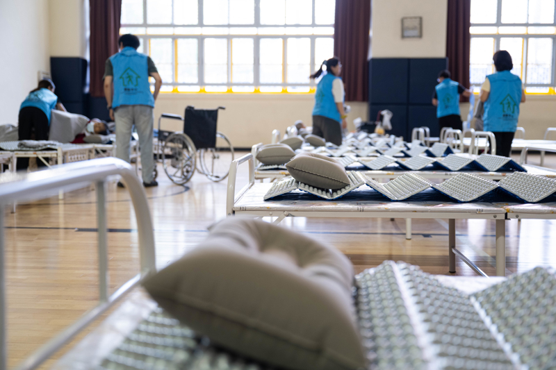 9月23日,避险中心工作人员在澳门塔石体育馆B馆整理床垫。\n 新华社 张金加 摄