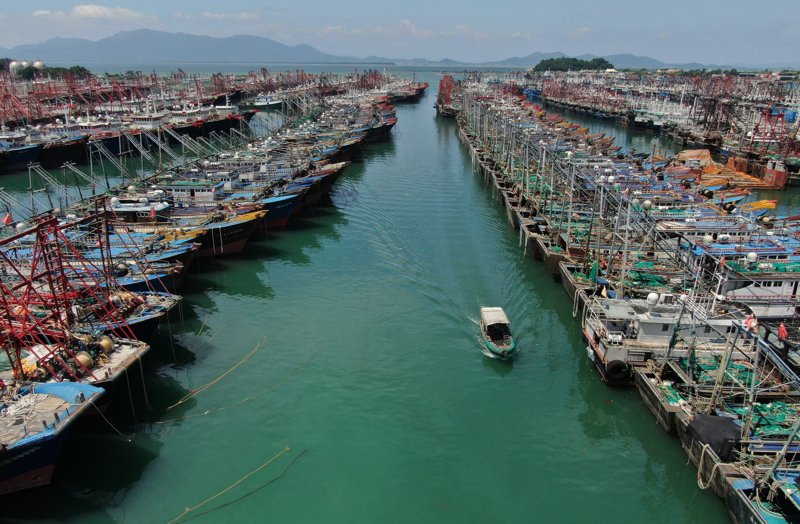 9月23日,广东阳江市海陵岛闸坡国家中心渔港停满了归港避风的渔船(无人机照片)。\n 新华社 邓华 摄