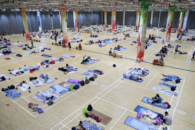 9月23日,深圳大学粤海校区羽毛球馆,避险群众在场馆内休息。 新华社 毛思倩 摄