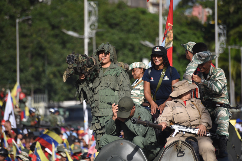 9月23日,委内瑞拉首都加拉加斯,玻利瓦尔民兵组织成员携带武器参加游行。\n 新华社 马科斯·萨尔加多 摄