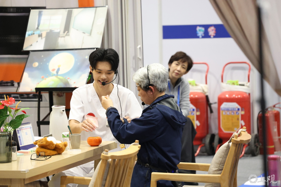 这是健康和社会照护项目选手闵思达(右)赛前“出征”,师傅曾小桉给他模拟“颁奖”,最终获得冠军。