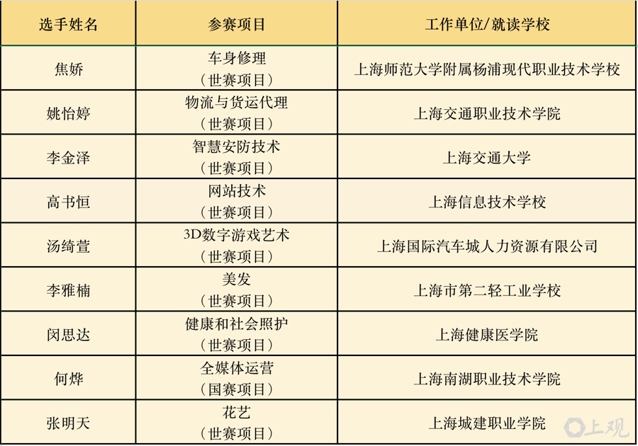 从获奖情况来看,上海选手在本市“3+6”重点产业以及“五个中心”建设相关比赛项目占据领先地位。世赛新增赛项、人工智能与信息技术融合的智慧安防技术项目成功摘金;汽车产业的车身修理项目、生命健康产业的健康和社会照护项目、电子信息产业的网站技术项目、时尚消费产业的花艺、美发项目均取得最高奖项,其中花艺项目包揽了金、银牌,车身修理项目实现“三连冠”;物流与货运代理项目中,上海选手实现了国赛“三连冠”。