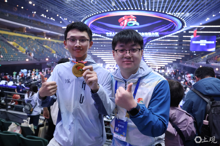 上海信息技术学校学生、网站技术选手高书恒和他的导师冯家乐欢庆凯旋。