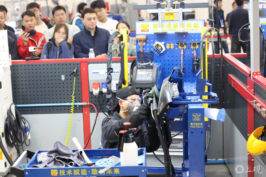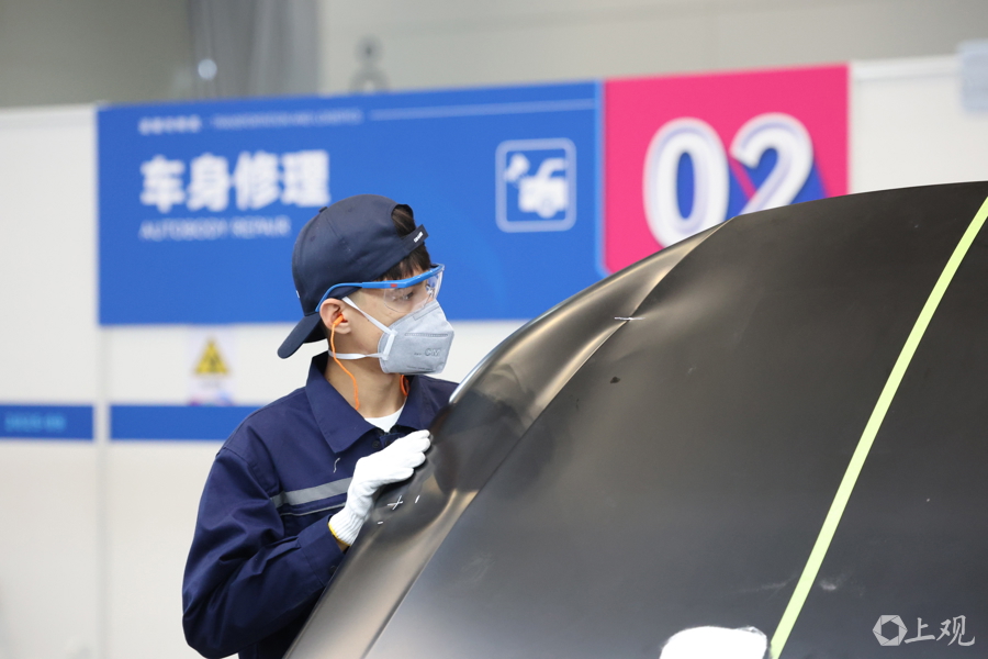 上海师范大学附属杨浦现代职业学校学生焦娇在车身修理比赛现场,他最终获得金牌。