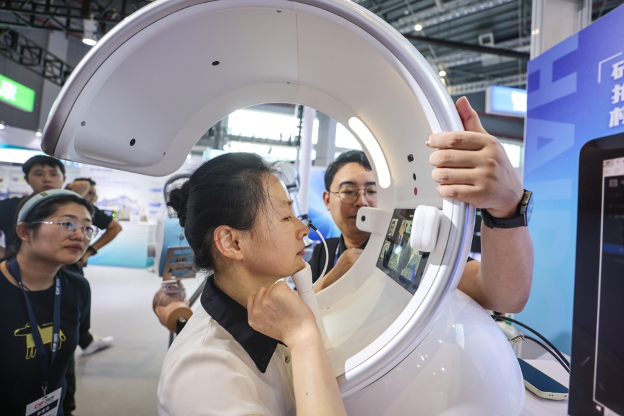 观众正在体验一款“发觉星毛发分级鉴定仪”。